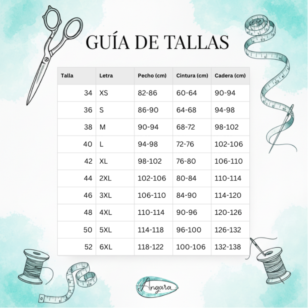 Para encontrar tu talla ideal, te recomendamos consultar la tabla de medidas. Cada cuerpo es único, y guiarte por tus medidas te ayudará a elegir la talla que mejor se adapte a ti. Si estás entre dos tallas, la opción mayor suele ofrecer un ajuste más cómodo.